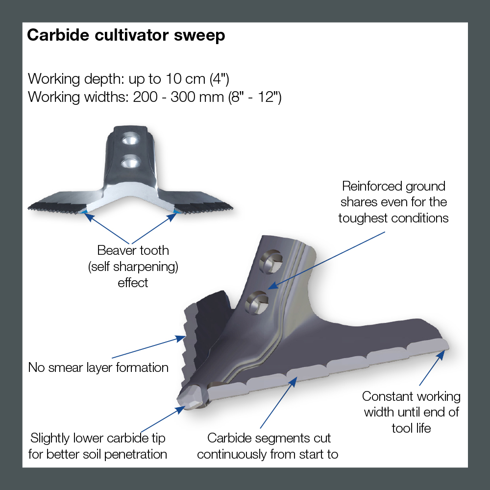 - Carbide tip positioned lower than conventional sweeps for better soil penetration.